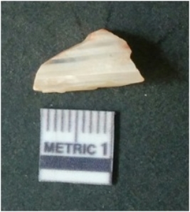 | Description / विवरण | The milky quartz flake has irregular fracture pattern and sharp flaked edges as a result of lithic knapping activity. The piece is pale, with surfacial flake scars and a bulbous end. The flake is white in color. |