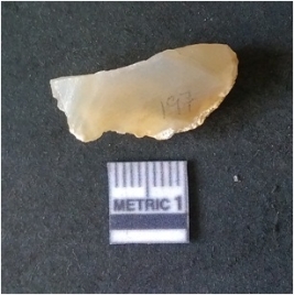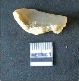 | Description / विवरण | It is chalcedony flake, translucent in appearance. The piece shows sharp pointed ends and flake scars on the surface as a result of flaking. The piece shows a bulb of percussion. |