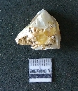 | Description / विवरण | The quartz fragment shows prominent flaks scars and sharp flaked ends as a result of flaking. The piece is translucent white and shows cryptocrystalline matrix. |
