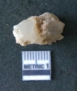 | Description / विवरण | The quartz fragment shows prominent flaks scars and sharp flaked ends as a result of flaking. The piece is translucent white and shows cryptocrystalline matrix. |