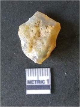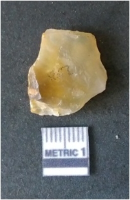 | Description / विवरण | It is chalcedony flake, translucent in appearance. The piece shows sharp pointed ends and flake scars on the surface as a result of flaking. The piece shows a bulb of percussion. |