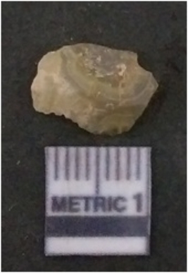 | Description / विवरण | The quartz flake has sharp flaked edges and pointed ends as a result of flaking. The piece is semi-transparent in nature with irregular fracture pattern. The piece is roughly triangular in shape and has a prominent bulb of percussion. |