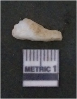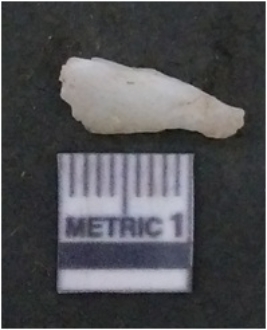 | Description / विवरण | The quartz flake has sharp flaked edges and pointed ends as a result of flaking. The piece is semi-transparent in nature with irregular fracture pattern. The piece is roughly triangular in shape and has a prominent bulb of percussion. |