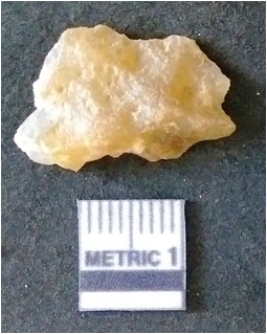 | Description / विवरण | The chalcedony flake has surfacial flake scars and negative bulb of percussion. The piece is yellow in color, crypto crystalline in nature and translucent. |