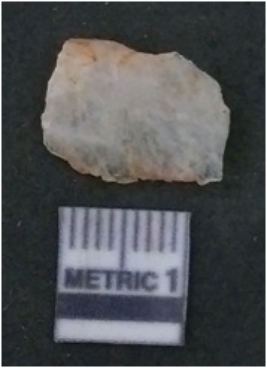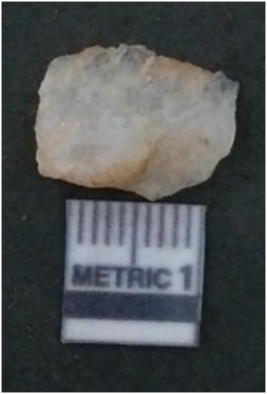 | Description / विवरण | The quartz flake has sharp flaked edges and pointed ends as a result of flaking. The piece is semi-transparent in nature with irregular fracture pattern. The piece is roughly triangular in shape and has a prominent bulb of percussion. |