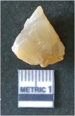 | Description / विवरण | The chalcedony flake has surfacial flake scars and negative bulb of percussion. The piece is yellow in color, crypto crystalline in nature and translucent. |