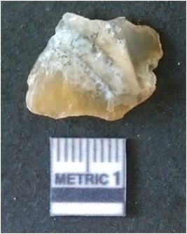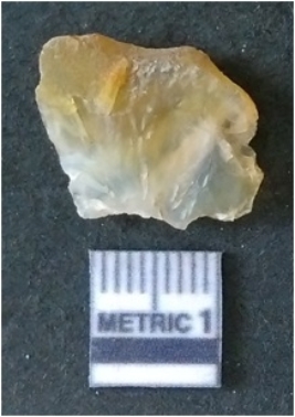 | Description / विवरण | The chalcedony flake has surfacial flake scars and negative bulb of percussion. The piece is yellow in color, crypto crystalline in nature and translucent. |