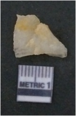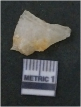 | Description / विवरण | The quartz flake has sharp flaked edges and pointed ends as a result of flaking. The piece is semi-transparent in nature with irregular fracture pattern. The piece is roughly triangular in shape and has a prominent bulb of percussion. |
