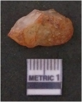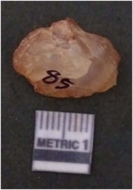| Description / विवरण | The quartz flake has sharp flaked edges and pointed ends as a result of flaking. The piece is semi-transparent in nature with irregular fracture pattern. The piece is roughly triangular in shape and has a prominent bulb of percussion. |