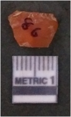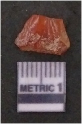| Description / विवरण | It is carnelian flake red in color, with sharp flakes edges and a small bulb of percussion owing to knapping activity. The piece has sharp flaked edges and a crypto-crystalline matrix. |