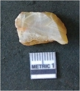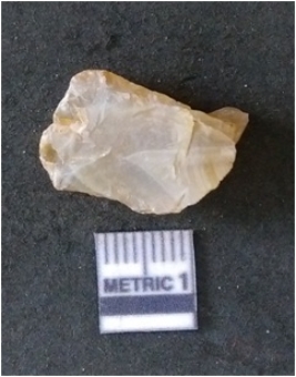 | Description / विवरण | The milky quartz flake has sharp flaked edges and pointed ends as a result of flaking. The piece is semi-transparent in nature with irregular fracture pattern. The piece is roughly triangular in shape and has a prominent bulb of percussion. |