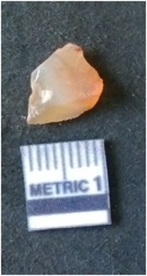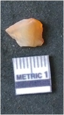 | Description / विवरण | The carnelian flake is reddish in colour, with translucent appearance. The flake has surfacial flake scars and sharp edges. |