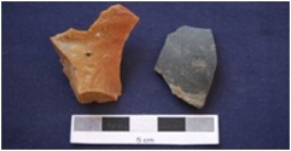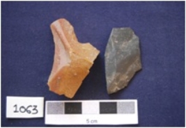 | Description / विवरण | Two flakes on chert, byproduct of tool manufacturing, prepared platform, bulb absent on ventral side. |
