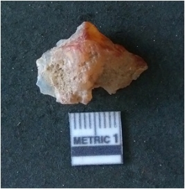 | Description / विवरण | It is carnelian flake red in color, with sharp flakes edges and a small bulb of percussion owing to knapping activity. The piece has sharp flaked edges and a crypto-crystalline matrix. |