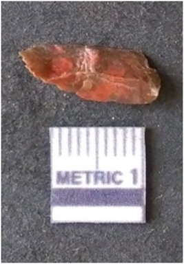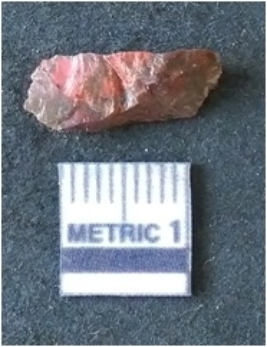 | Description / विवरण | The jasper piece is elongated, with surfacial flake scars and sharp flaked ends. The piece has a prominent bulb and ripple marks as a result of flaking. |