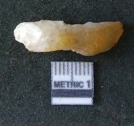 | Description / विवरण | The quartz fragment shows prominent flaks scars and sharp flaked ends as a result of flaking. The piece is translucent white and shows cryptocrystalline matrix. |