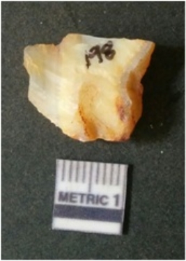 | Description / विवरण | The flake has irregular fracture pattern and sharp flaked edges as a result of lithic knapping activity. The piece is pale, with surfacial flake scars and a bulbous end. The quartz flake is rosy white in colour. |