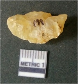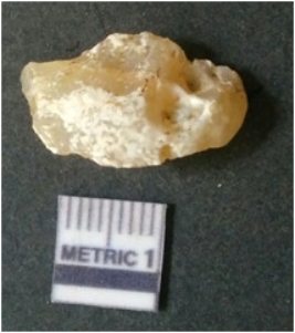 | Description / विवरण | It is chalcedony flake, translucent in appearance. The piece shows sharp pointed ends and flake scars on the surface as a result of flaking. The piece shows a bulb of percussion. |