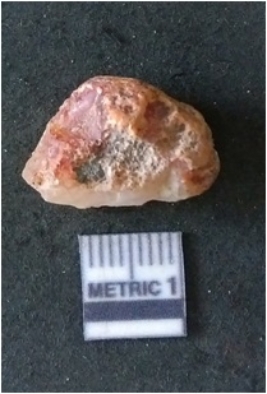 | Description / विवरण | The rosy quartz flake has sharp flaked edges and pointed ends as a result of flaking. The piece is semi-transparent in nature with irregular fracture pattern. The piece is roughly triangular in shape and has a prominent bulb of percussion. |