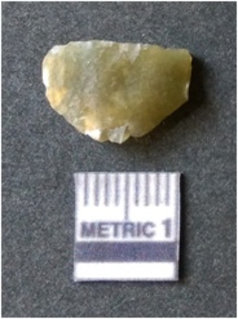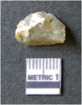| Description / विवरण | The flake has irregular fracture pattern and sharp flaked edges as a result of lithic knapping activity. The piece is pale, with surfacial flake scars and a bulbous end. The flake is of smoky quartz variety, grayish in colour and translucent in appearance. |