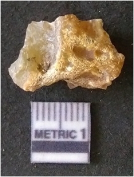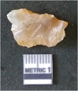 | Description / विवरण | It is chalcedony flake, translucent in appearance. The piece shows sharp pointed ends and flake scars on the surface as a result of flaking. The piece shows a bulb of percussion. The flake is flat with sharp edges and pointed ends. The piece is pale in color. |