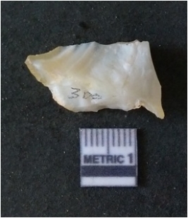| Description / विवरण | The quartz flake has sharp flaked edges and pointed ends as a result of flaking. The piece is semi-transparent in nature with irregular fracture pattern. The piece is roughly triangular in shape and has a prominent bulb of percussion. The flake is flat with sharp edges and pointed ends. The piece is pale in color. |
