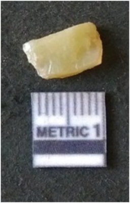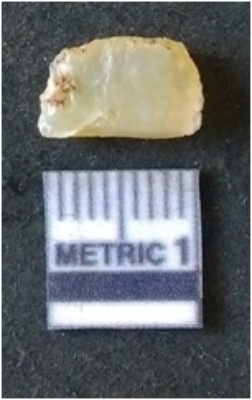 | Description / विवरण | The chalcedony flakehas a median flaked ridge and flake scars on the surface. The piece is cryptro-crystalline in nature and has translucent appearance. |