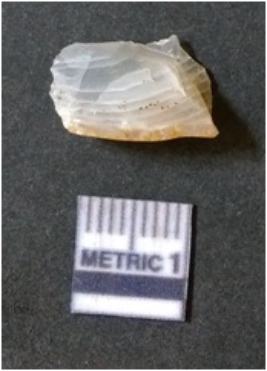 | Description / विवरण | The quartz flake has sharp flaked edges and pointed ends as a result of flaking. The piece is semi-transparent in nature with irregular fracture pattern. The piece is roughly triangular in shape and has a prominent bulb of percussion. |