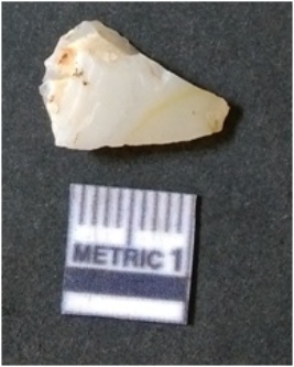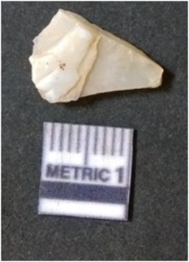 | Description / विवरण | The quartz flake has sharp flaked edges and pointed ends as a result of flaking. The piece is semi-transparent in nature with irregular fracture pattern. The piece is roughly triangular in shape and has a prominent bulb of percussion. |