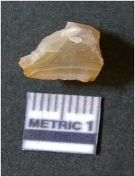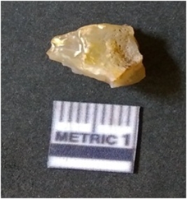 | Description / विवरण | It is chalcedony flake, translucent in appearance. The piece shows sharp pointed ends and flake scars on the surface as a result of flaking. The piece shows a bulb of percussion. |