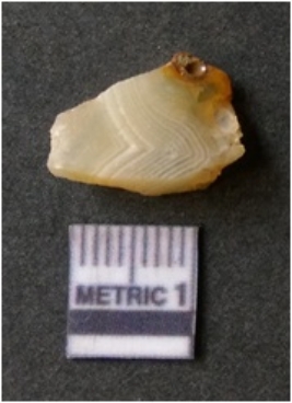 | Description / विवरण | The banded agate piece is crystalline in nature, with a smooth fracture pattern and visible bands on the flaked sides. The piece is pale in color and has sharp flaked ends. |