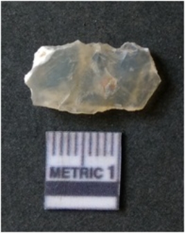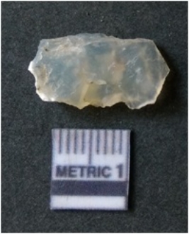 | Description / विवरण | The quartz flake has sharp flaked edges and pointed ends as a result of flaking. The piece is semi-transparent in nature with irregular fracture pattern. The piece is roughly triangular in shape and has a prominent bulb of percussion. |