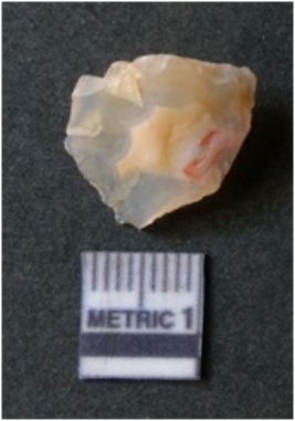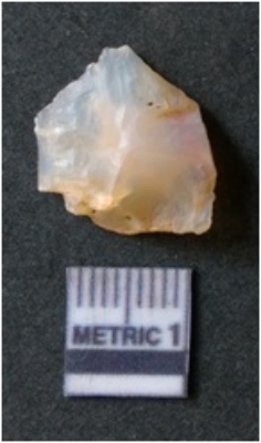 | Description / विवरण | The quartz flake has sharp flaked edges and pointed ends as a result of flaking. The piece is semi-transparent in nature with irregular fracture pattern. The piece is roughly triangular in shape and has a prominent bulb of percussion. |