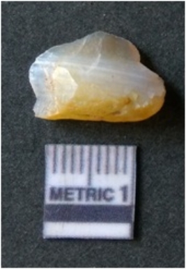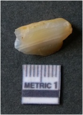 | Description / विवरण | The quartz flake has sharp flaked edges and pointed ends as a result of flaking. The piece is semi-transparent in nature with irregular fracture pattern. The piece is roughly triangular in shape and has a prominent bulb of percussion. |
