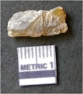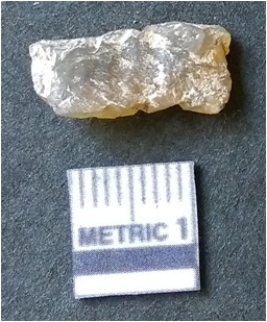 | Description / विवरण | The smoky quartz flake has sharp flaked edges and pointed ends as a result of flaking. The piece is semi-transparent in nature with irregular fracture pattern. The piece is roughly triangular in shape and has a prominent bulb of percussion. |