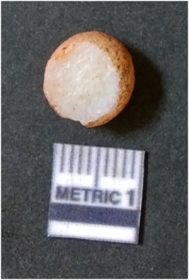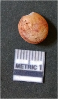 | Description / विवरण | The quartz piece is round in shape, with a reddish in color and white matrix. The piece shows a flat scars and sharp flaked edges. The negative bulb of percussion is prominently seen. |