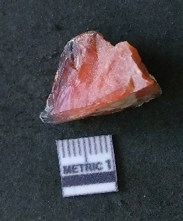 | Description / विवरण | The carnelian flake is reddish in color, with sharp flakes edges and a small bulb of percussion owing to knapping activity. |