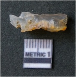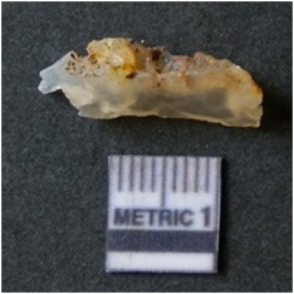 | Description / विवरण | The quartz flake has sharp flaked edges and pointed ends as a result of flaking. The piece is semi-transparent in nature with irregular fracture pattern. The piece is roughly triangular in shape and has a prominent bulb of percussion. |
