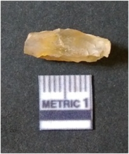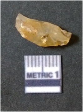 | Description / विवरण | The chalcedony flake is flat rectangular in shape with sharp flaked edges and surfacial flake scars. The color is pale |