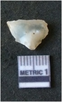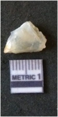 | Description / विवरण | The quartz flake has a prominent bulb of percussion and is roughly triangular in shape. The piece has sharp ends and flaked ridges as a result of lithic knapping. |