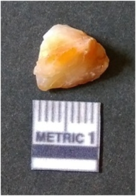 | Description / विवरण | It is chalcedony flake, translucent in appearance. The piece shows sharp pointed ends and flake scars on the surface as a result of flaking. The piece shows a bulb of percussion. |