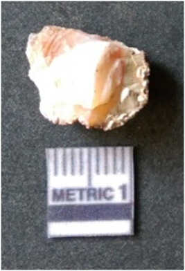 | Description / विवरण | The quartz flake has sharp flaked edges and pointed ends as a result of flaking. The piece is semi-transparent in nature with irregular fracture pattern. The piece is roughly triangular in shape and has a prominent bulb of percussion. |