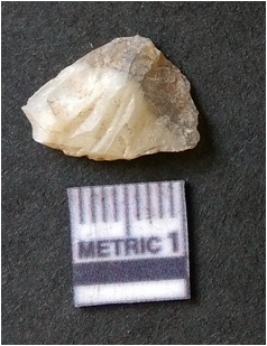 | Description / विवरण | The quartz flake has sharp flaked edges and pointed ends as a result of flaking. The piece is semi-transparent in nature with irregular fracture pattern. The piece is roughly triangular in shape and has a prominent bulb of percussion. |