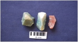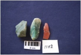 | Description / विवरण | Total No. of debitage 3. Core fragment with flake scars, prepared platform along one end, fragment of a flake with narrow platform, diffused bulb on ventral side. Chert 3 |