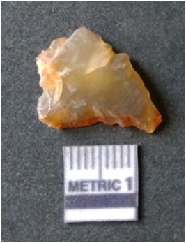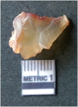 | Description / विवरण | It is chalcedony flake, translucent in appearance. The piece shows sharp pointed ends and flake scars on the surface as a result of flaking. The piece shows a bulb of percussion. |