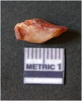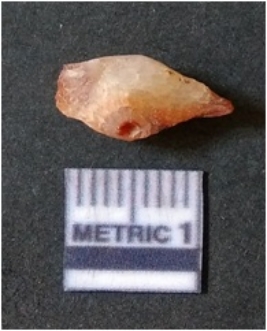 | Description / विवरण | It is chalcedony flake, translucent in appearance. The piece shows sharp pointed ends and flake scars on the surface as a result of flaking. The piece shows a bulb of percussion. |