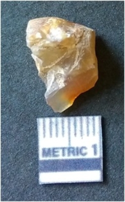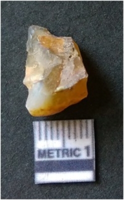 | Description / विवरण | It is chalcedony flake, translucent in appearance. The piece shows sharp pointed ends and flake scars on the surface as a result of flaking. The piece shows a bulb of percussion. |