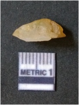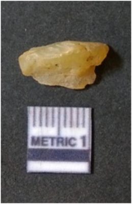 | Description / विवरण | It is chalcedony flake, translucent in appearance. The piece shows sharp pointed ends and flake scars on the surface as a result of flaking. The piece shows a bulb of percussion. |