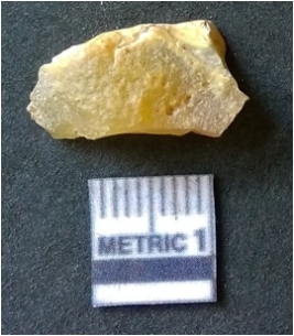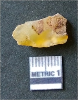 | Description / विवरण | It is chalcedony flake, translucent in appearance. The piece shows sharp pointed ends and flake scars on the surface as a result of flaking. The piece shows a bulb of percussion. |