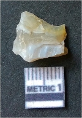 | Description / विवरण | The banded agate piece is crystalline in nature, with a smooth fracture pattern and visible bands on the flaked sides. The piece is pale in color and has sharp flaked ends. |